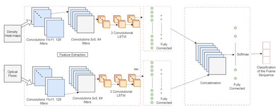 Detection of abnormal behavior in a crowded scene is a very promising research area that aims to prevent crimes before they happen. In [], the authors proposed a model for abnormal event detection in a crowded scene. As Figure 8 shows, the model utilizes density heat maps and optical flow of the image frame. The network has two streams: one for density heat maps and one for optical flows of the frames. Both streams go through the same number of convolutional layers followed by fully connected layers, and then, the output of both streams are concatenated to output a classification of the frame sequence, thus detecting any abnormality.