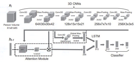 One of the state-of-the-art methods for action recognition was proposed in []. The authors of the paper proposed a 4D model that recognizes actions using volumes of persons in the image. First, a people classification CNN was used to classify and detect every person in the image. Then, using the cropped image frame of each person, the volume of the person was used as input to the network Action4DNet shown in Figure 9. The input was convoluted multiple times in a 3D CNN; then, an attention model was used to learn the most relevant local sub-volume features, while max pooling was used to learn the global features. Both features were used as input to an LSTM network for action classification. Action 4D achieved very high accuracy compared to other evaluated models. However, in a scene with 10+ people, the accuracy went down because the network is dependent on having each person’s body clearly visible in the image. This shows that accurate action recognition in a crowd scene is still far from an achievable task in the current year. Table 2 compares crowd action recognition methods.