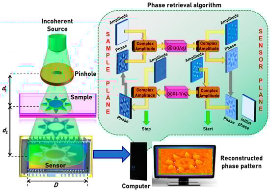 The computer simulation begins with a sampling of the planes of interest. The length and breadth of the matrices are set to match twice the image sensor’s length N1 and breadth N2 in pixels, and the pixel size Δ of the sensor is set as the sampling period for the simulation. The pseudocode for the entire process is shown in Table 1. The first step involves the definition of the computational space, sampling, meshgrid and wavelength. In the next step, the amplitude and phase matrices at the sample and sensor planes are constructed. The intensity pattern recorded by the sensor with a size of N1 × N2 is normalized and the square root values are calculated, and the matrix is zero padded to reach a matrix size of 2N1 × 2N2 to be the amplitude matrix A1 at the sensor plane. The phase matrix P1 at the sensor plane is set to be a constant for all pixels and the complex amplitude C1 is constructed using A1 and P1. The amplitude matrix A2 at the sample plane is constructed by assigning all the pixels a value of 1. The phase retrieval algorithm is executed with a for loop and begins at the sensor plane with a complex amplitude C1. The complex amplitude from the sensor plane is propagated to the sample plane by a convolution realized by three Fourier transform operations, given as [38]. At the sample plane, the phase matrix was carried on while the amplitude matrix is replaced by A2. The phase at the sample plane is extracted after several iterations, when the correlation coefficient C (x = 0, y = 0) does not vary beyond a threshold value.