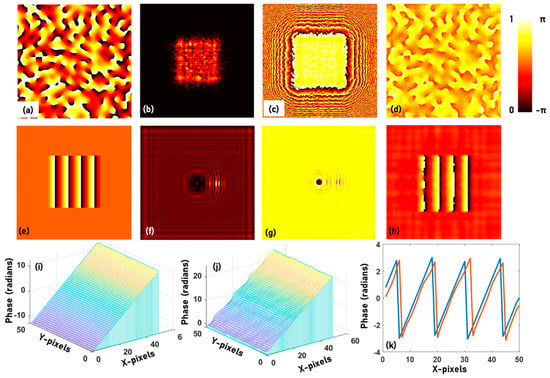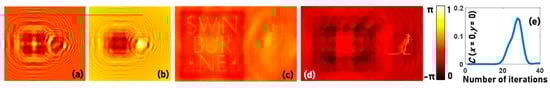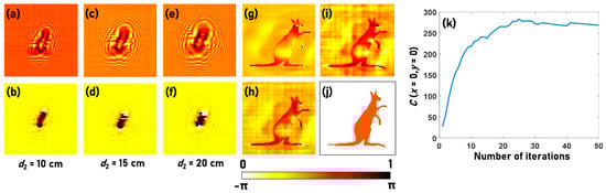 The next two objects, namely the logo and emblem of Swinburne, are binary amplitude objects at the sample plane and the sensor plane respectively. The phase patterns are calculated using the phase retrieval algorithm at the sample plane and the sensor plane respectively. The image of two objects, the corresponding amplitude and phase patterns at the sample and sensor planes after 200 iterations are shown in Figure 3a–f respectively. The Octave code for simulating the optical fields and phase retrieval is given in Supplementary Material 2. A thick object is constructed using the two thin phase objects made up of the Kangaroo phase object and the Swinburne logo, with a step phase difference of π with respect to the background. The distance between the two objects Δd = 20 cm, d1 = 200 cm and d2 = 20 cm. The Octave code for constructing the thick object using two thin objects is given in the Supplementary Material 3. The images of the amplitude and phase at the sensor plane are shown in Figure 4a,b respectively. The image reconstruction after 10 iterations executed for d2 = 20 cm and 40 cm are shown in Figure 4c,d respectively. The presence of the background phase from the other object affects the convergence of the algorithm, as shown in Figure 4e, and so it is necessary to carefully observe the reconstructions with the number of iterations. The fourth object is a complex object consisting of a scattering layer with 200 × 200 pixels size, with a scattering ratio σ = 0.12, synthesized using a Fourier GSA as described in [39]. The amplitude around the scattering layer is zero. The phase image of the scattering layer, the amplitude and phase at the sensor plane and the reconstructed phase image after 20 iterations are shown in Figure 5a–d respectively. The simulation is repeated for a linear phase with a maximum value of 8π, surrounded by a constant phase of zero but unit amplitude. The image of the linear phase with modulo-2π phase modulation, the amplitude and phase at the sensor are shown in Figure 5e–g respectively. The reconstructed phase is shown in Figure 5h. The original phase profile is shown in Figure 5i. The unwrapped reconstructed phase profile is shown in Figure 5j. The simulation can be carried out using one of the Supplementary Materials 1–3 and the phase unwrapping can be achieved by the unwrap function in a for loop of Octave. The modulo-2π phase profiles of the original and reconstructed phase patterns are compared in Figure 5k. The performances of the GSA under different computational configurations have been studied [40]. The formation of greyscale objects without and with modulo-2π phase structures have been discussed in [41].