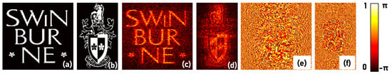 Image of the test objects (a) Swinburne logo at the object plane and (b) Swinburne emblem at the sensor plane. Reconstructed amplitude at (c) the object plane and (d) the sensor plane. Retrieved phase at (e) the object plane and (f) the sensor plane.