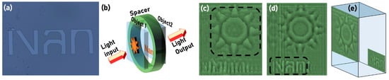From the colour bar shown in Figure 6, it is seen that the phase difference between the two levels is approximately π, which corresponds to a thickness of 530 nm, which is lesser than the measured value of 800 nm. The difference between the retrieved phase and experimental value is partly due to the broader spectral width of 33 nm, and partly due to experimental and computational errors. The results shown in Figure 6 are phase maps and images for a single axial plane and therefore does not constitute three dimensional QPI. To demonstrate QPI in 3D, thick objects were constructed by attaching two different thin phase objects with a 3 cm spacer. A phase object with a negative resist profile ‘Nan’ was fabricated using EBL, as shown in Figure 7a, and the thick object construction is shown in Figure 7b. The phase image reconstructions at the two planes are shown in Figure 7c,d respectively. In Figure 7c, the star object is in focus, while in Figure 7d, the ‘Nan’ object is in focus. The phase retrieval algorithm was executed with a different distance d + 3 cm, to obtain the reconstruction for the second plane. The combined phase reconstruction is shown in Figure 7e.