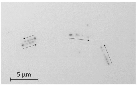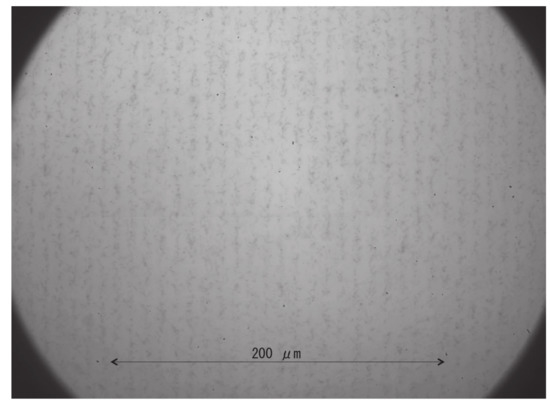 After neutron irradiation, an emulsion detector was developed (photoprocessed) at Nagoya University. Subsequently, the emulsion film was imaged using an epi-illumination optical microscope. The measured image of the 9 m pitch Gd grating is shown in Figure 3. In this image, the track area is alternately seen with and without tracks, and the period is approximately 9 m. An enlarged image was also captured using an epi-illumination optical microscope with a CMOS camera (see Figure 4). The pixel pitch was 54 nm. In this image, individual tracks can be recognized, but the tracks are close to each other and many of them intersect. We performed track analysis [11] for a region of this image, with the start of the tracks shown in Figure 5. Because the track is not visible in the boron layer, the neutron reaction point and the starting point of each track is slightly different.