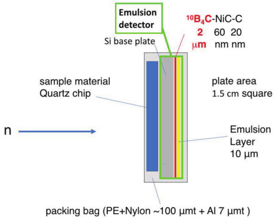 Details of the neutron emulsion detector are described in [11]. After depositing a 2 m thick BC layer on a Si substrate of thickness 400 m and coating it with NiC and C layers, an emulsion layer with a thickness of approximately 10 m is obtained (see Figure 2). The BC, NiC, and C layers were deposited using an ion sputtering system [15]. NiC is deposited for stabilizing the BC layer and C is for better adhesion of the nuclear emulsion gel to the sputtered layer. To achieve high detection efficiency in imaging measurements, the thickness of the BC is changed from that in the previous study [11]. The sample material is placed in close contact with the Si-substrate side to prevent damage to the emulsion layer. The cold neutrons incident from the Si-substrate side are absorbed by the BC layer. Because the kinetic energy of the incident neutron is sufficiently small compared to the Q value of the reaction, the and Li particles are emitted in opposite directions.