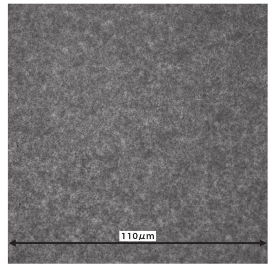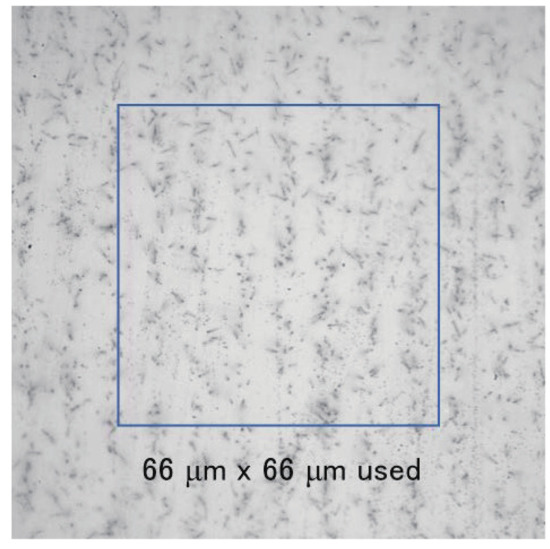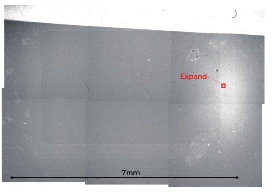 The image of the crystal chip is shown in Figure 7. It was taken at low magnification. The pixel pitch was m. A single field of view was approximately mm at most; therefore, it was not possible for the whole image to be captured in one field of view when measuring the crystal chip. Six images were pasted together with an error of approximately m after adjusting the brightness in Figure 7. The area in which the neutrons were detected is blackened by tracks, which indicates that the area with low neutron transmission appears white, and that with high neutron transmission appears black. The right center of the image is white, and the number of silver grains is reduced in this area. This may be because the emulsion in this area is thicker than in the others, resulting in weaker development and suppressed silver grain growth. A method must therefore be devised to ensure that the emulsion is applied uniformly. Figure 8 is an enlarged image of the right-hand side of the red square area in Figure 7. Although the silver grains are visible, it is difficult to identify the tracks because the grains exist very densely, even for the area with the suppressed growth of silver grains. It is difficult to identify the reaction points from the individual track information using this analysis. On the other hand, it is possible to discriminate the tracks’ shading by the difference in neutron transmittance, and it is possible to obtain images with a spatial resolution of the range.