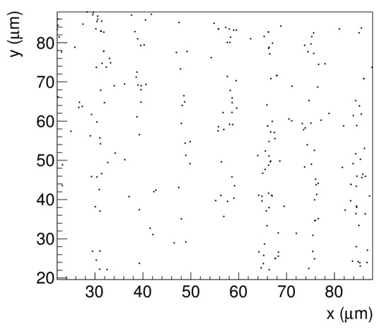 To use this emulsion detector as an imaging device, we need a statistics to discuss the transmission of the material, for which this image is insufficient. We performed a Rayleigh test [19,20] to check the periodicity of Figure 5. Here, we obtained the periodicity d and rotation for each of the n tracks at the maximum of the following equations for the starting point coordinates :