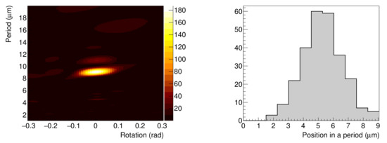 Figure 6 (left) shows the F(d,) value distribution. When 0.06 , the value of is the maximum. We can confirm that this figure reproduces the periodicity of the grating. The histogram of the distribution of the starting point of the tracks folded with the period of 9.06 is given in Figure 6 (right), with a standard deviation of m. The corresponding full width half maximum (FWHM) value is m, which is almost same as the aperture width of 3 m, indicating that achievable resolution in neutron imaging is better than 3 m.