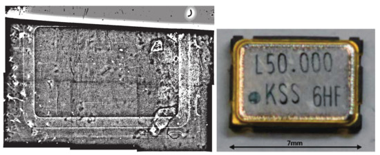 Transmission image of the quartz crystal oscillator taken using the emulsion detector. The area enclosed by the red square is enlarged and shown in Figure 8.