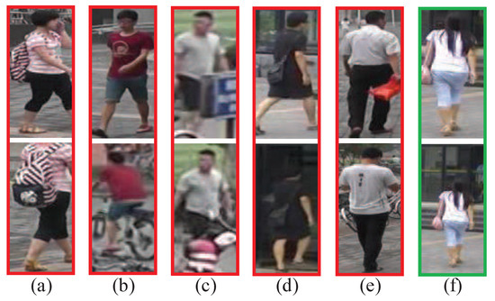 The key component of a Re-ID system is feature representation construction. Most early approaches relied on hand-crafted features whose performance is limited due to the gap between the low-level features and high-level semantics [4,5,6]. Recently, deep network-based feature learning has become a common practice in person Re-ID tasks. Deep neural network is originally developed for image classification [7], and its successful global feature learning strategy for classification was directly adopted for the person Re-ID approaches. The learned global representation pays less attention to local details [8], and often suffers weak discriminative ability in identifying targets with similar inter-class common properties or large intra-class differences [9]. For example, the following difficulties are encountered: (1) imprecise pedestrian detection affects global feature learning, e.g., shown in Figure 1a; (2) body posture changes make the learning more difficult, e.g., Figure 1b; (3) unexpected occlusion makes the learned features irrelevant to the human bodies, e.g., Figure 1c; (4) cluttered background or multiple pedestrians with highly similar appearances make the model difficult to distinguish, e.g., Figure 1d,e; (5) Misaligned bounding boxes make the model scale-variant, e.g., Figure 1f.