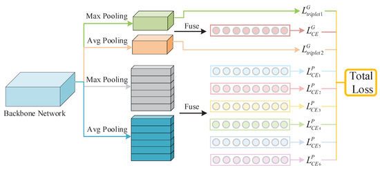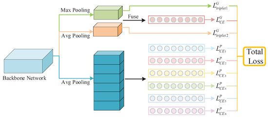 where, N and M respectively represent the total number of samples and the number of classes in the dataset; represents the weight vector for class c; and refers to an input feature map. Since the data samples of existing Re-ID datasets are not enough, directly using the cross-entropy loss can easily lead the model to over-fitting. So, Label smoothing Regulation (LSR) [34] is used to ease the problem. Thus, the cross-entropy loss with label smoothing is shown in Formula (4):