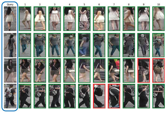 Top-10 ranking list for the query images on the Market-1501 datasets by our proposed method. The pictures with green or red frames indicate the same or different identity as the query image respectively.
