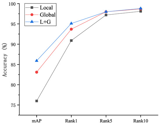 First, we exclusively plugged the local or global embeddings into the model to test its performance individually. Figure 6 presents the results on mAP and accuracies of Rank 1, Rank 5 and Rank 10 respectively. We can see that, (1) using only local embeddings is not as effective as using only global embeddings. It means saliency and generality attentions derived from global features play more discriminative roles than the local features. (2) Given the high accuracy rate of only using the global embeddings, the recognition accuracy can be further improved by fusing both local and global embeddings. It validates the design of integration of global and local branches in our proposed EXAM framework.