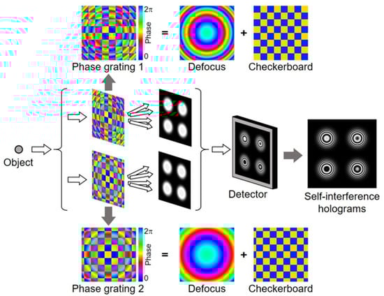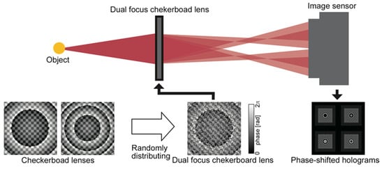 The optical setup for parallel phase-shifting single-shot in-line Fresnel incoherent correlation holography using a dual-focus checkerboard lens (DFCL) is shown in Figure 4. The details of the design method of DFCL are referred to [34]. The point is that a single DOE, which is a DFCL generates four phase-shifted holograms simultaneously. Therefore, the optical setup is simpler than the others and a single-shot phase-shifting method is realized. In Figure 4, a point source is assumed as an object. You can see phase-shifted Fresnel zone patterns as holograms.