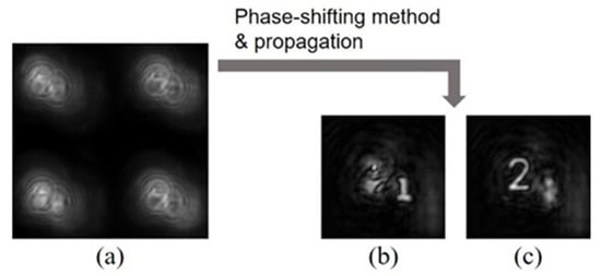 FINCH is an attractive 3D imaging technique because it can create holograms using a spatially incoherent light source [7]. FINCH generally requires a phase-shifting method that records a series of holograms with different phase shifts to eliminate background and conjugate terms. To record the holograms of static objects, a temporal phase-shifting method is used. However, it becomes impractical for capturing moving objects. To record a 3D video, a single-shot technique is required. Figure 2 shows a schematic of one of the phase-shifting techniques for FINCH. The method makes use of dual-phase gratings for creating four holograms in parallel [33]. The dual-phase gratings can be created with a spatial light modulator or a diffracting optical element. The light propagated from an object to be captured is divided into two lights. Each of the lights is modulated with a phase grating, and each of phase gratings consists of defocus and checkerboard phase patterns. The defocus phase pattern encodes the 3D information onto self-reference holograms [7]. The checkerboard phase pattern divides an incident light into four copies, which is necessary to create four holograms. Moreover, the checkerboard phase patterns in each phase grating are laterally displaced with respect to one another, which introduces different phase shifts into four copies on the basis of the Fourier shift theorem. After modulating the lights with the dual-phase gratings, they are recombined for interference. This results in the creation of four self-interference holograms with different phase shifts on an image sensor. Thus, it is possible to capture multiple holograms at the same time and implement the phase-shifting method. Figure 3 shows experimental results [33]. The objects to be captured were two transmission patterns with “1” and “2” on a United State Air Force (USAF) test chart. Figure 3a shows a raw image captured with an image sensor. The four holograms with different phase shifts were successfully created. The holograms were cropped with correlation and subsequently processed based on a phase-shifting algorithm. By applying an angular spectrum method, it is possible to reconstruct images at arbitrary depth planes. Figure 3b,c show the reconstructed images. The objects were successfully reconstructed by the single-shot technique with the dual-phase gratings. The advantage of this method is providing flexible choices for image sensors ranging from standard ones to scientific ones depending on cost, robustness to noise, frame rate, pixel pitch, quantization level, and the number of pixels.