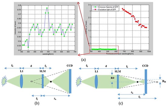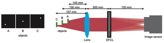 To confirm the FINCH using DFCL, numerical simulations were performed. The assumed optical setup is shown in Figure 5. Three spatially incoherent small objects with a line spectrum of a wavelength a 671 nm were assumed as the object. They were placed at distances of 143, 150, and 157 mm, respectively. The two focal lengths of DFCL were infinity and 280 mm. The DOE (DFCL) has 1280 × 1280 pixels, and the size of the pixel is 3.74 mm × 3.74 mm. The image sensor has the same number of pixels and size of pixel as the DOE. Other parameters were shown in Figure 5.
