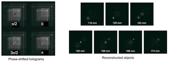 Simulation results were shown in Figure 6. Using four phase-shifted holograms (phase shifting quantities are shown in the figure) shown in Figure 6, reconstructed images at different axial distances were obtained. For the conditions in this simulation, the reconstruction distances of the objects were corresponding to 129, 150, and 166 mm, respectively. You can see three small objects were reconstructed at proper distances without a twin and zero-order images.