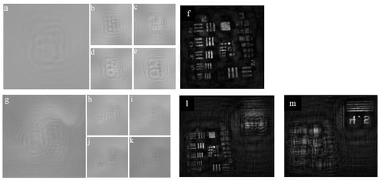 The experiment was carried out using USAF and (National Bureau of Standards) NBS objects. In the first experiment, a single plane object USAF was recorded, and the raw hologram is shown in Figure 8a. The four phase-shifted holograms corresponding to phase-shiftes 0, π/4, π/2 and 3π/4 are shown in Figure 8b–e, respectively. The reconstruction result by numerical backpropagation of the complex hologram synthesized by combining the four phase-shifted holograms is shown in Figure 8f. The experiment was repeated for a two-plane object composed of a USAF and NBS object with a spacing of 65 mm. The single and phase-shifted holograms are shown in Figure 8g–k, respectively. The reconstruction results for USAF and NBS are shown in Figure 8l,m, respectively.