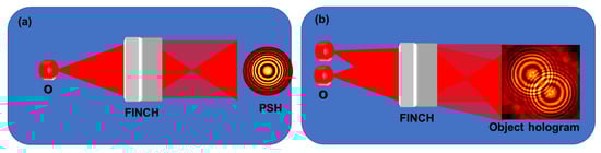 In Section 2, Section 3, Section 4 and Section 5, novel optical architectures and optical components have been proposed to convert the required multiple temporal phase-shifted intensity patterns into spatially distributed spots. The above studies are notable advances as it prepared FINCH for recording dynamic scenes. Section 2 and Section 3 demonstrated spatial multiplexing approach, while Section 4 and [13] demonstrated polarization multiplexing approach. The spatial multiplexing approach results in a reduced field of view while the polarization multiplexing affects the signal to noise ratio. Taking the above effects into consideration, in 2020, FINCH was realized with pattern recognition [14]. For a single point, a FINCH system generates a Fresnel hologram, as shown in Figure 9a; and for two points, the FINCH system generates two such Fresnel holograms, which are summed as shown in Figure 9b. So, if the Fresnel hologram for a single point, i.e., the PSH is known, then it should be possible to reconstruct any object hologram by a cross-correlation as FINCH is a shift-invariant system.