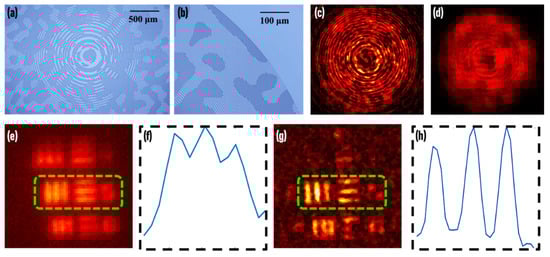 Optical microscope image of the (a) central part and (b) the outermost part of the fabricated diffractive lens. Images of the (c) PSH and (d) object hologram. (e) Direct imaging at one of the focal planes of the diffractive lens and (f) plot of averaged intensity values of the horizontal and vertical gratings shown in the green dotted box. (g) Reconstruction results and (h) plot of averaged intensity values of the horizontal and vertical gratings shown in the green dotted box. (Adapted from [14].)