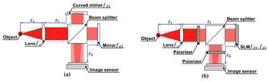 FINCH optical setup: (a) a Michelson interferometer-type imaging system; (b) a common-path interferometertype based on SLM imaging system. Reprinted with permission from [12]. Copyright (2021) Optical Society of America.