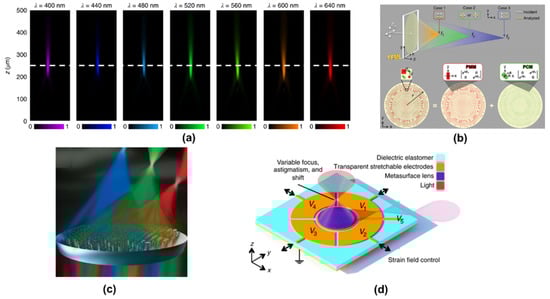 Multifunctional metalens applications. (a) Experimental results of achromatic metalenses. Reprinted with permission from Macmillan Publishers Ltd.: Nature Nanotechnology [72]. Copyright (2018). (b) Schematic illustration of the proposed twofold polarization-selective trifoci metalens (TFML), which establishes three foci at distinct focal planes depending on the linear polarization of incident and transmitted light. Reprinted with permission from Wiley Publisher: Advanced Optical Materials [78]. Copyright (2019). (c) Schematic of a metalens that simultaneously focuses and disperses the incident light. Reprinted with permission from Science [79]. Copyright (2018). (d) Schematic of the device in which a metalens and a DEA with five addressable electrodes are combined to allow for electrical control over the strain field of the metasurfac. Reprinted with permission from Science Advances [81]. Copyright (2018).
