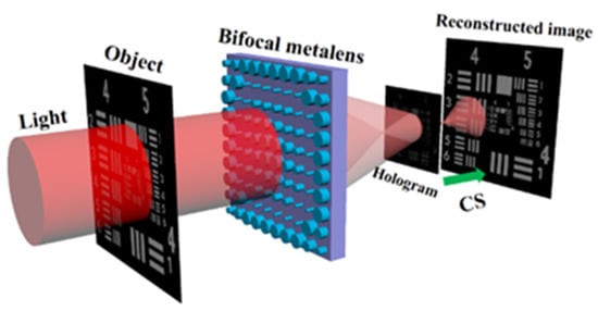 To solve the above challenges, a simple FINCH setup based on bifocal metalens has been proposed and demonstrated [37]. The metalens is an ultra-thin two-dimensional flat device composed of cylinder nanofins designed based on Huygens’ principle. Metalens can form two real images of an object along the optical axis, and form self-interference in the overlapping region, as shown in Figure 14. Afterwards, the real-time recorded digital hologram in the overlapping area is analyzed through compressive sensing algorithm, which can reconstruct the 2D or 3D object. This setting can ease the traditional FINCH system and is promising in replacing the combination of diffractive lens and SLM in FINCH. Because each meta-atom is isotropic, the bifocal metalens is polarization insensitive. Meanwhile, as a passive device, the bifocal metalens does not require energy consumption. It greatly reduces the size of the FINCH system. Therefore, it simplifies the recording process and improves application capability. The lightweight configuration provides a new way for the integrated and portable FINCH experimental system.