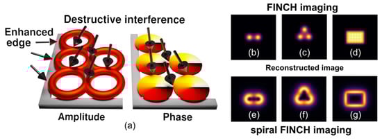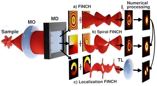 FINCH technology was established as a well-proven approach to incoherent digital holography allowing imaging of three-dimensional (3D) amplitude objects in spatially incoherent light. Following the discovery of the method almost 15 years ago [1,17,24], the research resulted in revealing unique FINCH imaging capabilities [8,30,31], designing optimized arrangements [27,82,83], and utilizing new optical elements provided by advanced technologies [35,84]. FINCH has succeeded as an efficient and easy-to-implement imaging tool of fluorescence microscopy, capable of overcoming the diffraction resolution limit [85]. Simultaneously with FINCH developing, specific light fields represented by vortex and diffraction-free beams brought progress into photo-activated localization imaging [86] and gave rise to spiral microscopy [87,88]. The effects used were mostly associated with the phase topology of optical vortices; hence, interference conditions were necessary.