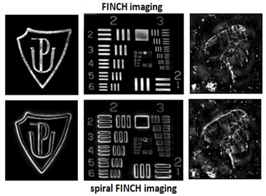 The image formation in spiral FINCH is demonstrated in Figure 16. A spiral correlation pattern is created for a point object using a vortex reference wave generated by a phase modulation device. An annular impulse response with a vortex phase is reconstructed from three phase-shifted spiral correlation patterns (Figure 15b). The spiral patterns arise simultaneously for all points of a 3D object, and their intensities are superimposed under incoherent illumination. The image is reconstructed coherently; hence, the image intensity is affected by the destructive interference stemming from the vortex phase (Figure 16a). This effect became the basis of spiral microscopy using coherent light [87,88]. When two point sources of the same amplitude are imaged, the resulting intensity disappears just between the image centers due to the vortex interference. The images of the two-point object restored by FINCH and spiral FINCH are compared in Figure 16b,e. Between the bright spots created by FINCH for the three-point object (Figure 16c), a dark area appears in spiral FINCH because the vortex images interfere destructively there (Figure 16f). In the object area where the amplitude of the emitted or reflected light remains homogeneous, the intensity vanishes when spiral FINCH restores the image. This effect is demonstrated by the imaging of a rectangular area formed by 7 × 5 array of point sources of the same amplitude (Figure 16d,g). The vortex interference provides the edge-contrast enhancement in which the intensity is significant only in the regions of amplitude gradients. The spiral edge-contrast enhancement is well documented by imaging the Palacký University sign, USAF test, or flea (Figure 17). In the digital alternative, the vortex impulse response is introduced by the spiral phase modulation performed numerically when processing records acquired without a vortex reference wave [38].