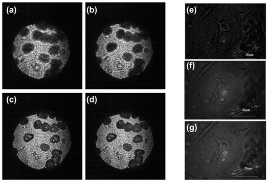 In this paper, FINCH was demonstrated using a geometric phase (GP) lens [55] with a polarization-dependent focus. The GP lens is based on engineering the Pancharatnam–Berry phase [56] using photo-aligned layers of liquid crystals. The GP lens converts left-hand circular polarization (LHCP) light and right-hand circular polarization (RHCP) light into converging and diverging waves with the same radii of curvatures, respectively. So for a linearly polarized input light, the GP generates both converging and diverging wavefronts with a splitting ratio of 50:50. The GP also offers a wavelength independent efficiency in the range 450–650 nm. The application of GP to FINCH will substantially reduce the cost of implementation of FINCH in a reduced space and offer polarization-sensitive behaviors. Single-shot FINCH has been demonstrated using a 4-polarization camera and with space-division multiplexing [57], as shown in Figure 7.
