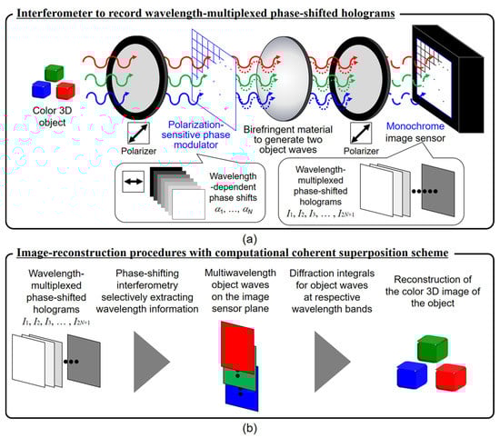 - Hara, T.; Tahara, T.; Ichihashi, Y.; Oi, R.; Ito, T. Multiwavelength-multiplexed phase-shifting incoherent color digital holog-raphy. Opt. Express 2020, 28, 10078–10089. [Google Scholar] [CrossRef]