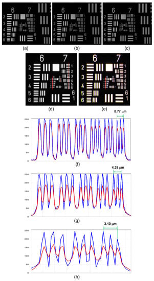 Since, only a single shot is needed in this approach instead using an SLM, the beam modulator was fabricated as randomly multiplexed Fresnel lenses [1] using electron beam lithography. The optical microscope images of the diffractive element are shown in Figure 10a,b. The images of the PSH and object hologram for the USAF object Group 5, Elements 5 (50.8 lp/mm) and 6 (57 lp/mm) are shown in Figure 10c,d, respectively. The direct imaging result recorded at one of the focal planes of the diffractive element and the plot of the averaged intensity of the horizontal and vertical gratings are shown in Figure 10e,f, respectively. The reconstructed image (α = 0, β = 0.6) is shown in Figure 10g and the plot of the averaged intensity of the horizontal and vertical gratings is shown in Figure 10h. Comparing Figure 10f,h, an enhancement in visibility is seen in FINCH.