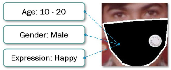 Face recognition has been one of the active research problems studied in computer vision for decades due to its many practical applications, for instance, in the automotive industry, security, retail, beautification, and social networks [1,2,3,4,5]. So-called facial expression recognition systems are computer programs which aim to automatically translate and understand facial actions from visual information. The processing of facial expressions is often confused with emotional interpretation in the field of machine vision. Due to the high demand for facial expression recognition systems, there have been many developments in this field. Due to the COVID-19 pandemic, which has caused many people to wear face masks to prevent infection, it has become urgent to meet the challenge of analyzing faces wearing masks. There are few methods that have been introduced to create a face mask dataset [6], detect the face [7], recognize facial identities [8,9], enable multitask learning [10,11,12], and recognize facial features [13]. The face detection systems have been developing over the years but due to COVID-19 everything has come to a hold [14], as the wearing of masks has meant that earlier methods have struggled to analyze human faces. The idea proposed here will overcome this problem, the study assisting not only in predicting the age of a person wearing a face mask [1,15,16] but also in predicting gender [2,17,18] and mood (expression) [19,20]. Moreover, we will also release our masked face dataset upon publication. Multitask learning with different backbones gave better results for our created dataset than other methods. The input and the output of the method are shown in Figure 1.