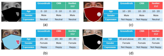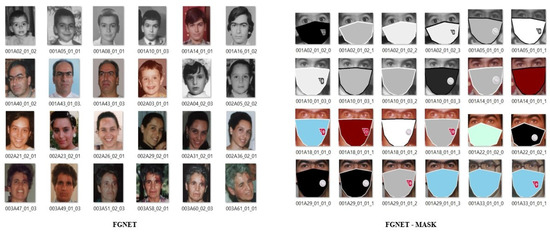 First, the human face images (without a mask) from FGNET [26] were adopted with their previously labelled ages. Then, the dataset was further manually labelled with the individuals’ gender and expression. In total, we obtained 925 images with three types of labels on each image. Next, the images were run through OpenPose [22] to detect and generate 2D landmark points on detected faces in the dataset. Eventually, we synthesized the face mask using the Pillow package [45], after receiving the landmark points, with a variety of colors and logos. Since the initial dataset only contains 925 images, which is insufficient for training a machine, we constructed four replicas of each masked image with various permutations of mask color, as shown in Figure 4. We also changed the undetected landmark points, resulting in the final FGNET-MASK dataset of 3404 images with rendered face masks, which is sufficient for a machine to be trained. Age, gender, and expression were all branded in the dataset. The dataset contains four age categories: under 10, 10–20, 20–40, and over 40 to balance the samples for each age group. There are only two genders labelled: Male and Female. Finally, expression labels were classified as Happy, Neutral, or Unhappy.