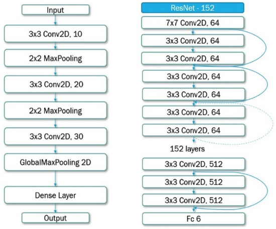 According to the categories of the respective classes, the single model has three convolutional layers, in which each is followed by a maximum pooling layer, and dense layers. Convolutional layers use a filter to make a feature map that summarizes the presence of detected features in the input. Maximum pooling layers are expected to downsample feature detection in feature maps. We used Adam optimization for training deep networks. Our newly constructed dataset was tested again with a different network with higher complexity of convolutional layers and maximum pooling, namely, ResNet152, with 60,430,849 total parameters [45], to compare its accuracy with the traditional CNN model with only 7654 parameters. ResNet-152 [46] used pre-trained weights on ImageNet as their weights to train the model. The top fully connected layers were excluded, and the model was fine-tuned with 137 layers out of 152.