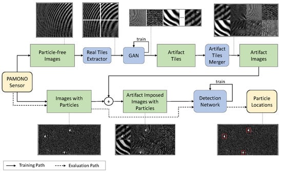 Schematic representation of overlaying training images with generative adversarial network (GAN)-generated artifacts from composite tiles. The PAMONO sensor is used to record samples without particles of interest (upper part) and samples including such particles (lower part) for the training process. The trained detection model is then used to search for particles in images where their presence is unknown. Dashed arrows show the path of images in the evaluation process, while solid arrows represent the path of images in the training process. The images in dotted boxes visualize the single steps by examples. The yellow boxes illustrate start and end of the pipeline, green boxes represent data and blue boxes mark algorithms.