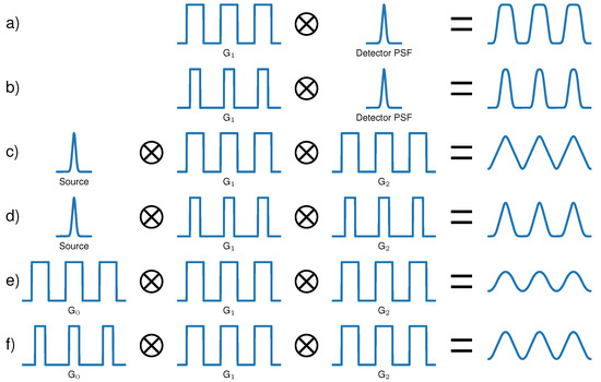 Conventional X-ray and neutron radiography methods exploit differences in the absorption of radiation between different materials. Apart from this well-established imaging method, other advanced contrast mechanisms have been developed, exploiting the wave properties of radiation [1,2,3,4,5,6,7,8,9,10,11]. Some of these methods use periodic X-ray and neutron optics (e.g., gratings, masks, compound refractive arrays) to modulate the beam’s intensity and measure its refractive and dispersive changes after transmitting an imaged object. The measured intensity modulation (IM) depends on the spatial and spectral properties of the used radiation source, the optics in the beam, the sample, and the used detecting system. Some methods use coherent synchrotron radiation [1,2,3,4,5,6] or micro-focus sources [10,11], but also low coherence sources such as conventional X-ray tubes [7,12] or neutron beamlines with relatively large pinhole apertures became applicable [8,9]. Some systems resolve the IM directly with high-resolution detectors [11,13], while others sample the periodic IM with an additional absorbing grating or mask in several exposures [7,8,10]. To model the blurring influence of a detector or an extended source and the relative motion between two gratings during acquisition, the observed IM can be calculated theoretically by the convolution of all gratings’ transmission profiles of the system [14], as illustrated in Figure 1. To extract an image of the sample-related interactions, a mathematical model of the IM based on the understanding of the physical properties of the system is desired. In most of the literature where 1D-sensitive systems (usually linear gratings or masks) are used, the IM is modeled by a simple sinusoidal function or a Gaussian, e.g., in aperture-based imaging [10,15]. However, there are many different reasons why the measured modulation could become a more complex function.
