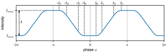 Additionally, ϕ = 2 π x p 1 applies, where x is the spatial coordinate and ϕ is the corresponding phase as labeled on the horizontal axis in Figure 2. Δ ϕ is the phase position, I m i n and I m a x are the minimal and maximal intensity, respectively, and δ 0 to δ 3 indicate the transition points of the individual sections. From the additional boundary condition that I P P and d I P P d x are continuous functions,