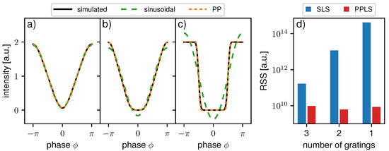 For the first comparison of the sinusoidal and PP approach, the processing results of the three example systems without the influence of sampling-related artifacts are discussed. Therefore, we used 100 equidistant, precise phase steps for fitting, and the accuracy of the fits was evaluated by calculating the RSS on the entire dataset. Figure 3a–c shows a comparison between the simulated IM and fitted curves using both models. For the three-grating interferometer in Figure 3a, the sinusoidal, as well as the PP function, match the simulated IM well. For the two-grating interferometer, the linear part of the rather trapezoidal IM is fitted well; however, the minimal and maximal intensities are clearly underestimated by the sinusoidal model. As expected, the PP function resembles the shape of the modulation significantly better. Similar behavior is even more apparent in the third example in Figure 3c with a rectangular shape of the IM. The sinusoidal model overestimates the peaks and underestimates the minimum drastically, while the PP function reproduces the shape robustly. As observed in Figure 3d, the fitting accuracy represented by the RSS is much better for the PPLS than the SLS approach in all three exemplary systems. This was expected to some extent, since the PPLS optimizes one more free parameter than the SLS. However, the RSS of PPLS stays almost constant for sinusoidal, trapezoidal, and rectangular IMs, confirming its robustness for different shapes.