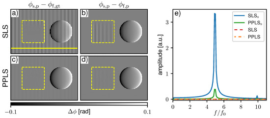 To visualize sampling-related artifacts, the sample phase ϕ s , p was processed with the ground truth flat-field phase ϕ f , gt in Figure 4a for SLS and c for PPLS. Respective differential-phase contrast (DPC) images processed with the fitted flat-field phase ϕ f , p are shown in Figure 4b,d. SLS fitting shows pronounced fringe artifacts when processed with the ground truth phase, while PPLS processing reduces them significantly. This is also confirmed by the respective Fourier spectra in Figure 4e. When the image is processed with the fitted flat-field phase (Figure 4b), the background is flat since the sampling artifacts are compensated by identical phase biases. The same applies to PPLS fitting as observed in Figure 4c,d, as well as in the respective Fourier spectra. Within the scatter wedge in Figure 4a, the fringe artifacts disappear with increasing scattering strength since the IM transforms to a sinusoidal shape. When processed with fitted flat-fields (Figure 4b), the fringe artifacts appear where the dark-field (DF) signal is increased. This is a result of the biased flat-field and the artifact-free sample phase in the scattering object. Similar fringe artifacts are also present in the phase signal of the sphere in Figure 4b) since the phase in both the flat-field, as well as the sample image, is affected by sampling artifacts. Due to the improved fitting accuracy for non-sinusoidal IMs of the PP approach, in the respective PPLS image processed with the fitted phase (Figure 4d), the occuring artifacts in the scattering object are clearly reduced compared to the SLS.