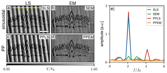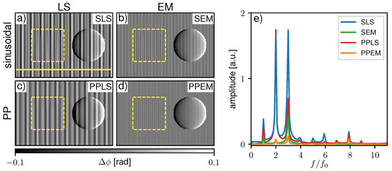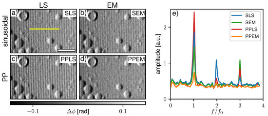 Figure 8a–d show a comparison of the four previously discussed processing schemes with experimentally acquired data by the single phase grating X-ray interferometer. The sample is a substrate with hollow and filled silica micro-spheres. Respective Fourier spectra along the yellow line in Figure 8a are given in Figure 8e. Since the IM created by the system is asymmetric and non-sinusoidal, strong fringe artifacts appear in SLS processing (Figure 8a). SEM (Figure 8b) and PPLS (Figure 8c) fitting hardly reduce the artifacts, which implies that both phase-stepping jitter and non-sinusoidal IMs are present. Only considering both with the PPEM processing (Figure 8d) brings a clear improvement. Some residual fringes still remain as the Fourier spectrum (Figure 8e) shows; however, they are less pronounced compared to the background noise level.