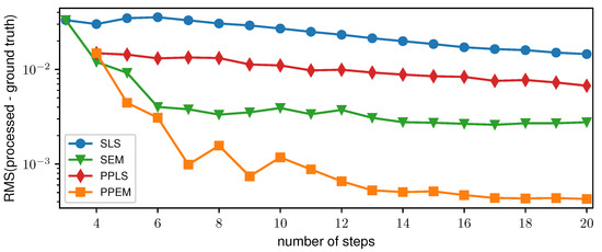 To evaluate the performance of the PP approach depending on the number of phase steps, the root-mean-square (RMS) of the difference between the processed and ground truth DPC images of the two-grating interferometer was determined. Ten datasets for each number of phase steps were simulated and processed in the range from three (SLS and SEM) and four (PPLS and PPEM), respectively, and up to 20 phase steps. The averaged RMS for each number of phase steps and each processing algorithm is displayed in Figure 6. For SLS and PPLS, a slow decrease in the RMS can be seen, whereas the PPLS is always below the SLS. SEM and PPEM show a steep decrease for small numbers of phase steps which flattens for larger numbers of phase steps. For five or more phase steps, the RMS of the PPEM is below the SEM and therefore performs superiorly in terms of sampling artifact reduction.