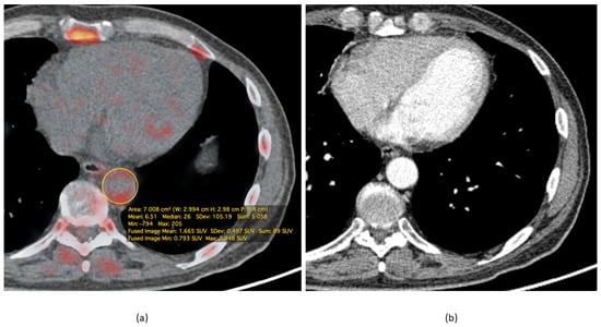 Representative FDG PET/CT of a male 65-year-old patient, diagnosed with small cell lung cancer. The study was performed 60 min after intravenous injection of 185 MBq of FDG. (a) Fusion image demonstrates increased FDG uptake in the thoracic descending aorta walls with the maximum standardized uptake value(SUVmax) = 2.9. (b) The arterial phase of the contrast-enhanced CT at the corresponding level shows only mild thickening of the vessel wall. These findings suggest an active inflammation process in the vessel walls. All calculations were performed with OsiriX MD (Pixmeo SARL, Bernex, Switzerland).
