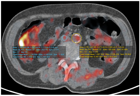 The same patient and study as in Figure 1. At the infrarenal level of the aorta, more prominent calcific atherosclerotic plaques are visible. The image shows a method of calculating TBR as a ratio of SUV in the aorta region of interest and SUV in the venous blood pool on the same level—in this case, the inferior vena cava was used. TBRmax at this level was about 1.01. All calculations were performed in OsiriX MD (Pixmeo SARL, Bernex, Switzerland).