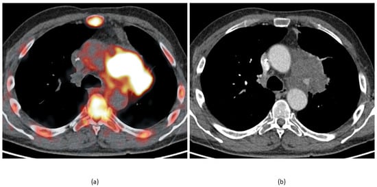 In particular, according to A. L. Figueroa et al., the uptake of FDG in the walls of arteries, as measured by routine PET/CT, significantly improved the prediction of cardiovascular events in individuals under investigation for cancer diseases, and also indicated the possible timing of such events since the target-to-background ratio appeared to be inversely related to the time before the onset of the cardiovascular event [26]. These results are supported by the study by R. Iwatsuka et al., where it was found that the target-to-background ratio (TBR) was associated with significantly higher coronary heart disease events rate, with a hazard ratio of 1.19 per 0.1 increase in TBR [27]. With the use of FDG, a number of “vulnerable” patients, particularly those suffering from rheumatoid arthritis, showed a vulnerable plaque phenotype and more frequent aortic damage than patients without rheumatoid arthritis [28]. This demonstrates that PET with FDG can be used to identify the most high-risk groups of patients. In a recent study by B. Koa et al., it was demonstrated that lung cancer patients have higher FDG uptake in different parts of the thoracic aorta compared to patients with extrapulmonary cancer, and it was suggested that the former group of patients has a higher risk of atherosclerosis and subsequent adverse cardiovascular events [29]. A representative finding is presented in Figure 1.