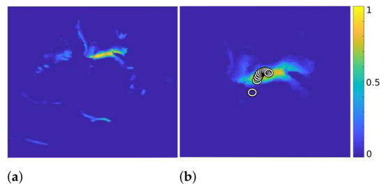 Here, , and are the results of the method in Section 3.1 and are kept fixed. The parameter is a threshold. Since the pixel values of B are enforced to grow, if , a small value of ensures that barely recognizable noise in does not cause the corresponding pixel values in B to increase. As a result, this noise is not segmented in B. The first regularization term applies (isotropic ) Total Variation (TV) [49] on B for a regularization parameter with the effect of penalizing the edge length of the segmented area in B. In the discrete setting, isotropic Total Variation (TV) is defined as (see [50]), where and are matrices that calculate the gradient on b by discretized forward differences in the spatial x- and y directions, and b the vectorized form of B.