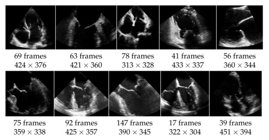 - Ouyang, D.; He, B.; Ghorbani, A.; Lungren, M.P.; Ashley, E.A.; Liang, D.H.; Zou, J.Y. EchoNet-Dynamic: A Large New Cardiac Motion Video Data Resource for Medical Machine Learning; NeurIPS ML4H Workshop: Vancouver, BC, Canada, 2019. [Google Scholar]