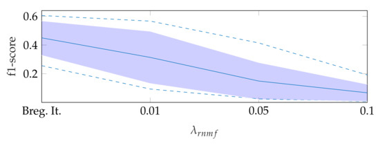 During our initial experiments with Equation (2), we observed that the natural shrinking bias of the norm (see [47]) significantly harms the performance of the RNMF model, even for small values of . On the other hand, , leads to highly non-unique minimizers of Equation (2) with the undesired trivial solution , being one of them.