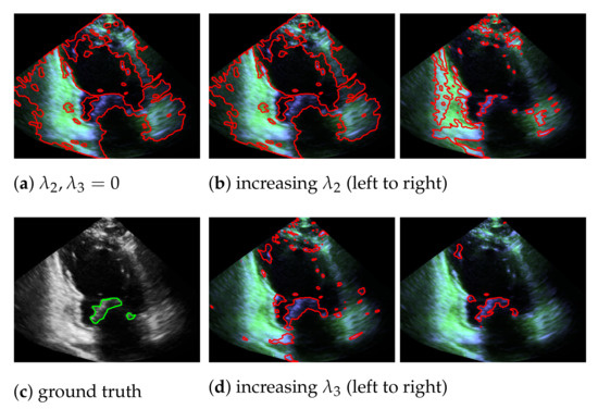 In our mitral valve segmentation method that does not include the windowing step (see Section 3.4), we first split the muscle and the mitral valve structure as described in Section 3.1 by solving Equation (2), followed by the segmentation step of Section 3.2. Here, a strong weighting of the third regularization term in Equation (8) has a positive effect on the segmentation of the valve, as structures that are not located in the area of the muscle structure are preferably segmented. This is shown in Figure 8, by showing the behavior of the segmentation depending on and , whereby a large value in provides better capturing of the mitral valve than an increase of .