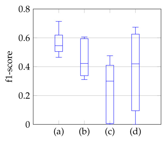 As a third step, we remove the segmented noise with the refinement that is described in Section 3.3. The resulting f1-scores compared to the ground truth are visualized in Figure 9 in the form of boxplot diagrams for segmentation, using the windowing approach in (a), for the method of Dukler et al. [9] in (c) and for the method of Corinzia et al. [40] in (d). The f1-score for automatic segmentation is shown in (b) and shows a slightly lower median f1-score than the one in (a), but without conspicuous negative outliers regarding the segmentation accuracy. Outliers indicate a complete missing of the mitral valve, which is not the case here. In [40], there are shown outliers, whereas [9] has a slightly lower f1-score with a larger variation. In addition to the boxplot diagrams, the average recall, precision, and f1-score values are given in Table 4.