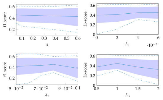 F1-score for automatic segmentation depending on , where the dashed lines show the minimum and maximum f1-score values, and the standard deviation is indicated by the filled range.